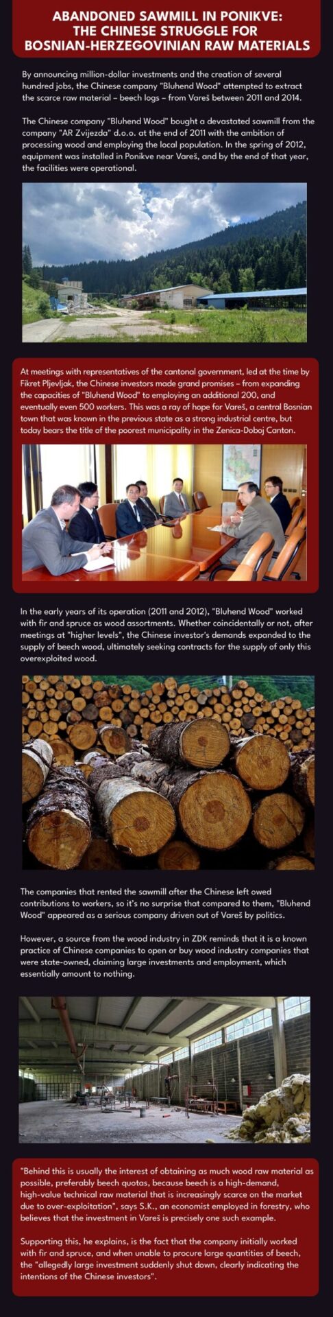 “I don’t worry about them. That aggressive policy continually finds impoverished areas from which to extract raw materials and pays cheap labour. Vareš is just one in a series of examples. It is high time that state authorities seriously address their activities in Bosnia and Herzegovina, especially in light of the sanctions imposed on China”, concludes our source from the wood industry.