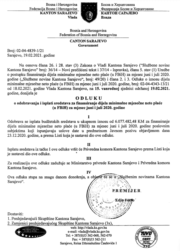 PHOTO: DECISION OF THE SARAJEVO CANTON GOVERNMENT