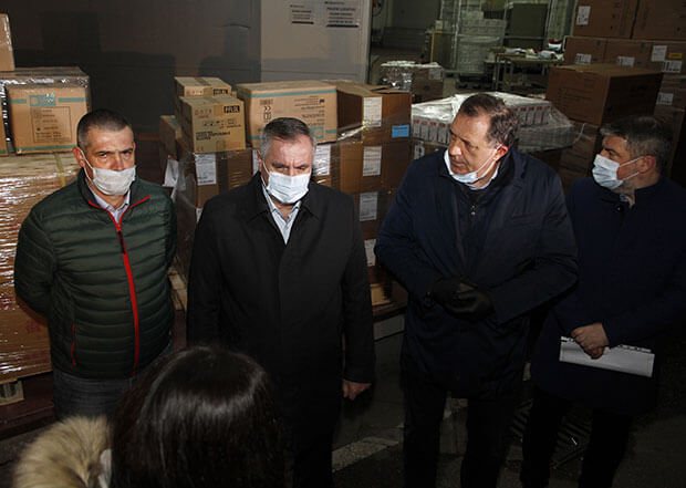 Posljednjeg dana marta Srbija je Republici Srpskoj poslala prvi kontigent pomoći. U kontigentu se nalazilo pet kliničkih i pet transportnih respiratora, 30.000 epidemioloških maski N95, 2.000 zaštitnih odela, 200 naočara i 50.000 rukavica, te lijekovi. Ovu humanitarnu pomoć dočekao je sam vrh Republike Srpske, Milorad Dodik, srpski član Predsedništva BiH, Radovan Višković, predsednik Vlade Republike Srpske i Alen Šeranić, ministar zdravlja Republike Srpske.