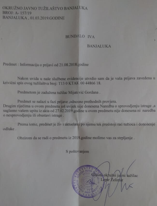 Više od pola godine nakon toga, Bundalo se obratila Okružnom javnom tužilaštvu u Banjaluci, sa zahtjevom da joj se dostavi informacija u kojoj fazi se njen predmet nalazi. Glavni okružni tužilac Želimir Lepir (poznat i po kontroverznom postupanju u slučaju ubistva Davida Dragičevića), odgovorio joj je da u njenom predmetu još uvijek nije donesena naredba o sprovođenju istrage i da po njemu tek predstoji rad tužioca.