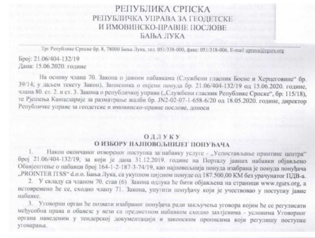 Republička uprava za geodetske i imovinsko-pravne poslove Republike Srpske 15.6. donijela je Odluku o izboru najpovoljnijeg ponuđača za nabavku usluge “Uspostavljanje printing centra”. Jedini, pa samim tim i najpovoljniji ponuđač, bila je firma “Prointer”.