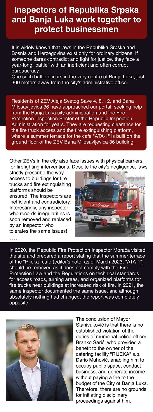 Residents believe that the inaccurate determination of the actual facts regarding the fire route and fire extinguishing platform for the ZEV Bana Milosavljevića 36 building by the Fire Protection Inspector of the Republic Inspection Administration of RS has harmful consequences for the rights and interests of ZEV’s condominium owners to ensure a free fire route and fire extinguishing platform as envisaged by the Fire Protection Law.