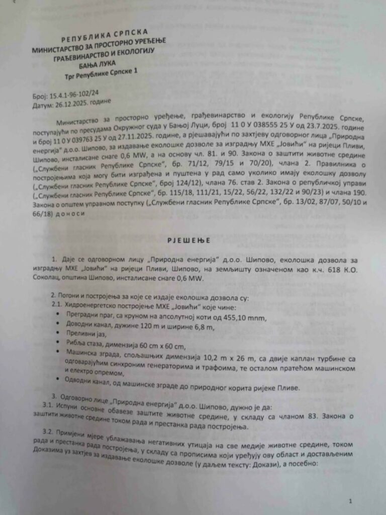 Sve tri ekološke dozvole za mHE Jovići potpisao je novi-stari ministar za prostorno uređenje, građevinarstvo i ekologiju u Vladi RS Bojan Vipotnik.