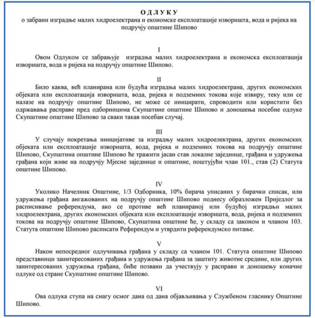 U dokumentu je naglašeno da se nijedna inicijativa ne može pokrenuti bez jasnog stava lokalne zajednice, građana i udruženja sa teritorije Šipova. Time je ova opština, barem na papiru, stala među rijetke lokalne zajednice u BiH koje su zauzele eksplicitan stav protiv malih hidroelektrana.