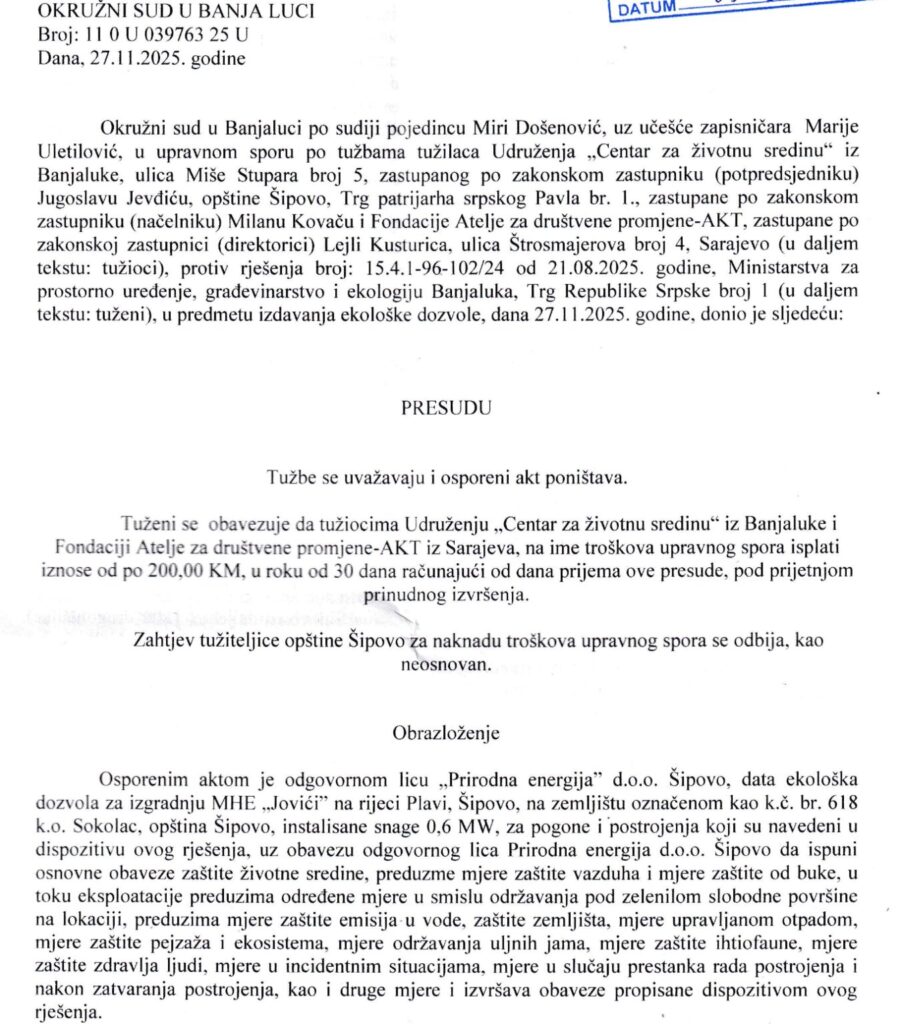 Prvom presudom od 23. jula 2025. godine, sud je zaključio da Ministarstvo nije ispoštovalo zakonsku obavezu jer je, umjesto zasebnog projekta, navelo samo opšte mjere, bez organizovanja javnog uvida u taj dokument.