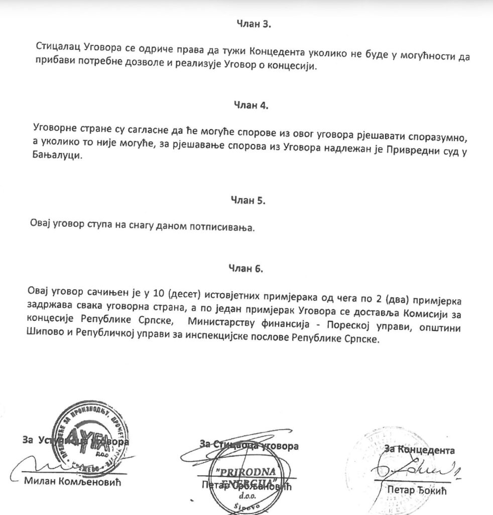 U ugovoru kojim je „Prirodna energija“ preuzela koncesiju 2016. godine, a koji je u ime Vlade RS potpisao ministar Petar Đokić, kao Koncedent, stoji da se sticalac ugovora „odriče prava da tuži Koncedenta ukoliko ne bude u mogućnosti da pribavi potrebne dozvole i realizuje Ugovor o koncesiji“.