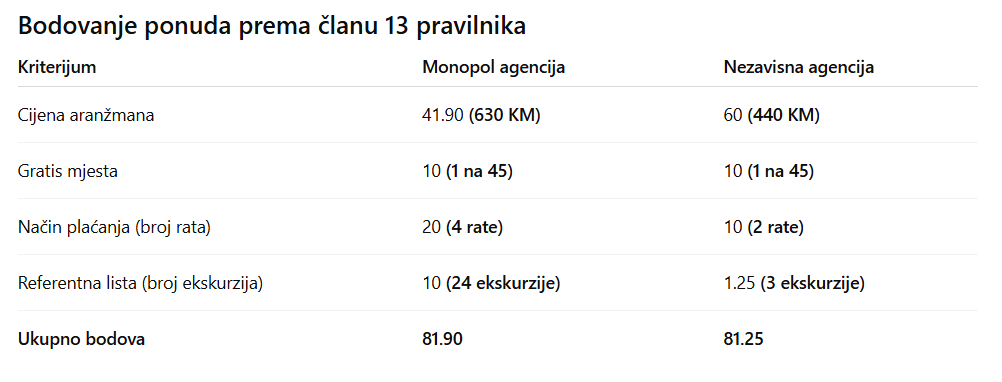 Iako Nezavisna agencija nudi cijenu nižu za 190 KM po učeniku, sistem bodovanja dovodi do toga da skuplja ponuda ipak dobije više bodova i bude prvorangirana. Razlika je mala (0.65 bodova), ali je dovoljna da skuplja ponuda pobijedi na rang listi.