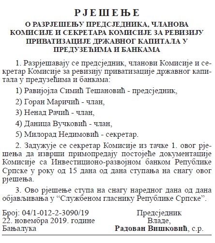 Na sjednici održanoj krajem novembra smijenjena je Ravijojla Simić Tešanović koja je bila predsjednik komisije kao i članovi Goran Maričić, Nenad Račić i Danica Vučković te sekretar Milorad Nedimović koji je dužan da raspoloživu dokumentaciju ustupi Investiciono-razvojnoj banci Republike Srpske.