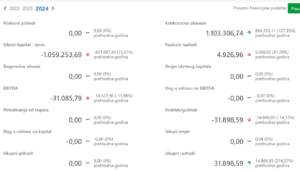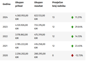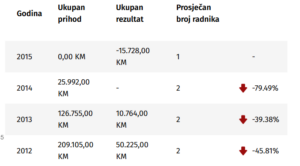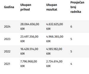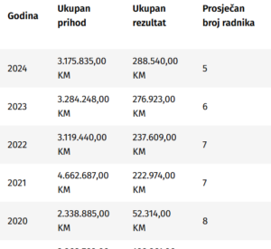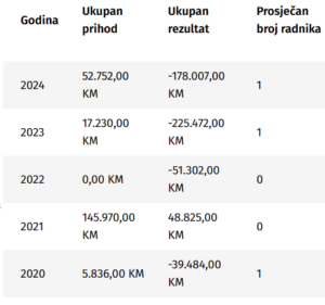 Finansijski izvještaji firme OMC d.o.o. godinama pokazuju isti obrazac – simbolične prihode, velike gubitke i gotovo nepostojeći broj zaposlenih. U 2023. godini firma je ostvarila nešto više od 17.000 KM prihoda, uz gubitak veći od 225.000 KM. Ni 2024. godina nije donijela suštinski preokret: prihod je porastao na oko 52.000 KM, ali je minus i dalje iznosio više od 178.000 KM.