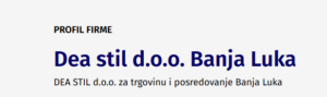 • DEA STIL d.o.o. – firma sa stabilnim višegodišnjim poslovanjem, čiji se zbirni prihodi u posljednjim godinama mjere desetinama miliona KM, uz kontinuiranu dobit u rasponu stotina hiljada do više od milion KM, te realan broj zaposlenih.