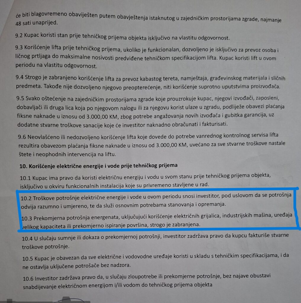 U zapisniku o primopredaji stanova navodi se da će investitor snositi troškove električne energije i vode do prenosa brojila na imena stanara, pod uslovom da se potrošnja odvija umjereno i razumno.