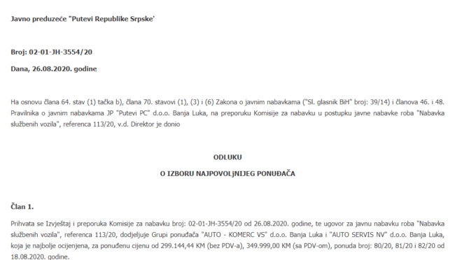 Nabavka službenih automobila je dodjeljena grupi ponuđača “AUTO – KOMERC VS” d.o.o. Banja Luka i “AUTO SERVIS NV” d.o.o. Banja Luka, koja je, kako se navodi u Odluci o izboru najpovoljnijeg ponuđača, najbolje ocijenjena. Ujedno, bili su i jedini ponuđači.