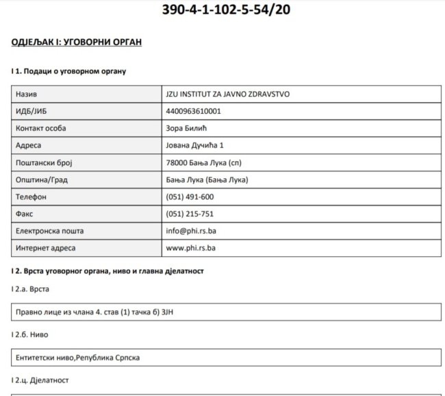 “JZU Instititut za javno zdravstvo Republike Srpske, u skladu sa Zakonom o javnim nabavkama BiH, proveo je pregovarački postupak bez objave obavještenje sa konzorcijumom Travel for Fun i Promeding d.o.o. Laktaši za nabavku 30.000 zaštitnih odijela, 50.000 FFP2 zaštitnih i 500 digitalnih beskontaktnih termometara”, stoji u njihovom saopštenju u kojem smo morali da korigujemo brojne pravopisne i gramatičke greške, da bismo uopšte mogli da ga objavimo.