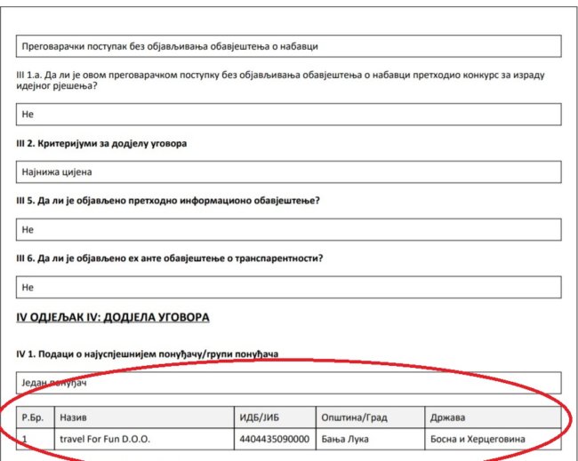 Međutim, da iz Instituta ne govore istinu pokazuju dokumenti koji su u našem posjedu. Kako stoji u zvaničnim dokumentima obavještenja o dodjeli ugovora broj 390-4-1-102-5-54-/20, pregovarački postupak je proveden SAMO sa agencijom “Travel for Fun”, kojoj je i dodijeljen novac.