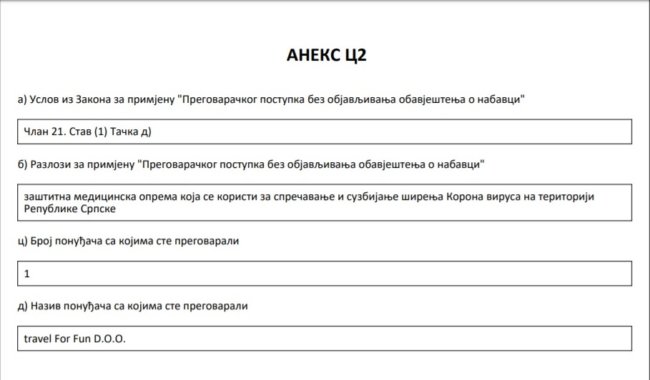 Iz Instituta su dodali i da je u nabavci zaštitne medicinske opreme učestvovao Travel4Fun, ali kao član grupe ponuđača koju, osim imenovanog, čini i registrovani veleprometnik medicinskim sredstvima, Promeding d.o.o. Laktaši, ali i da je cijena bila manja nego što je naš portal naveo.