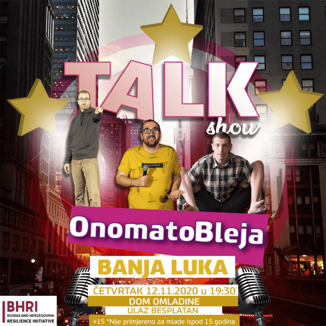 Onomatobleja ekipa dolazi u Banjaluku sa potpuno novom predstavom pod nazivom: Onomatobleja TALK SHOW! Publika će imati priliku da pogleda ovu predstavu večeras sa početkom od 19:30 u Domu omladine.