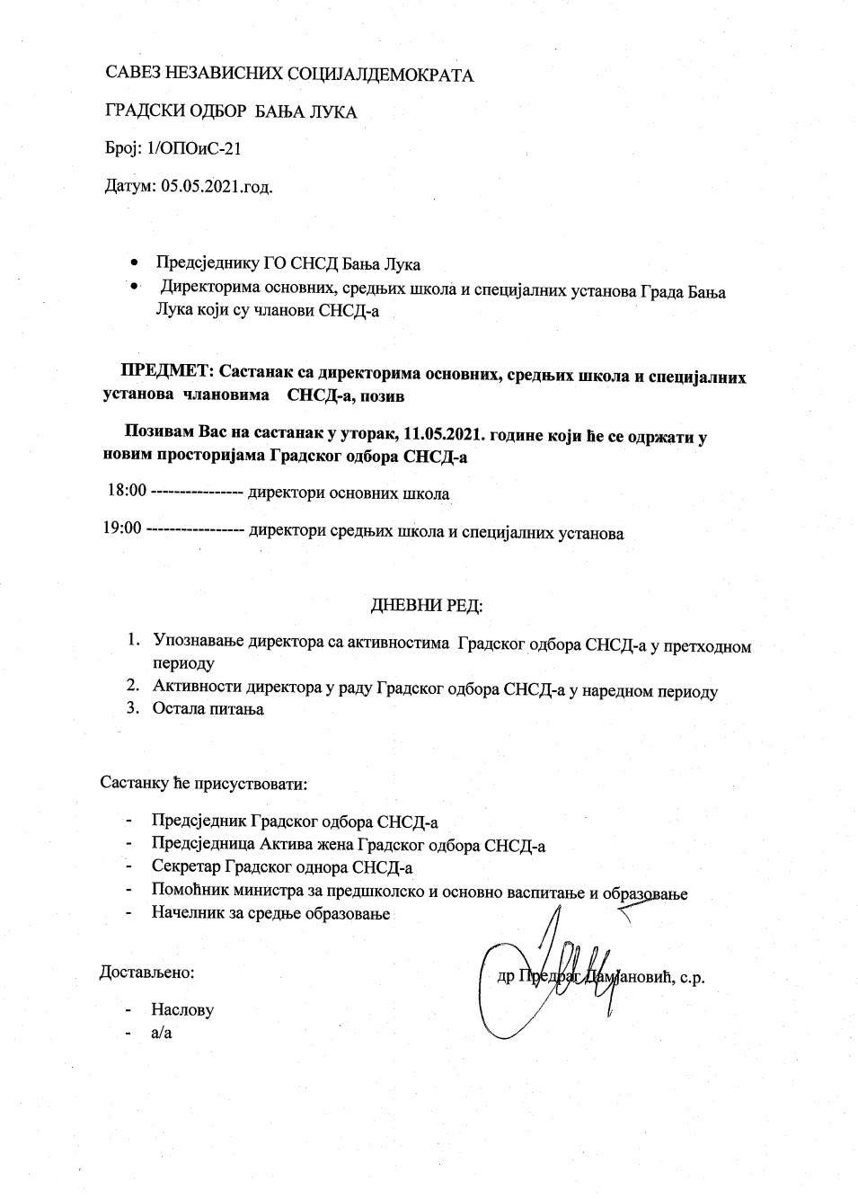 U dopisu stoji da će se sastanak održati 11. maja u novim prostorijama Gradskog odbora SNSD-a.