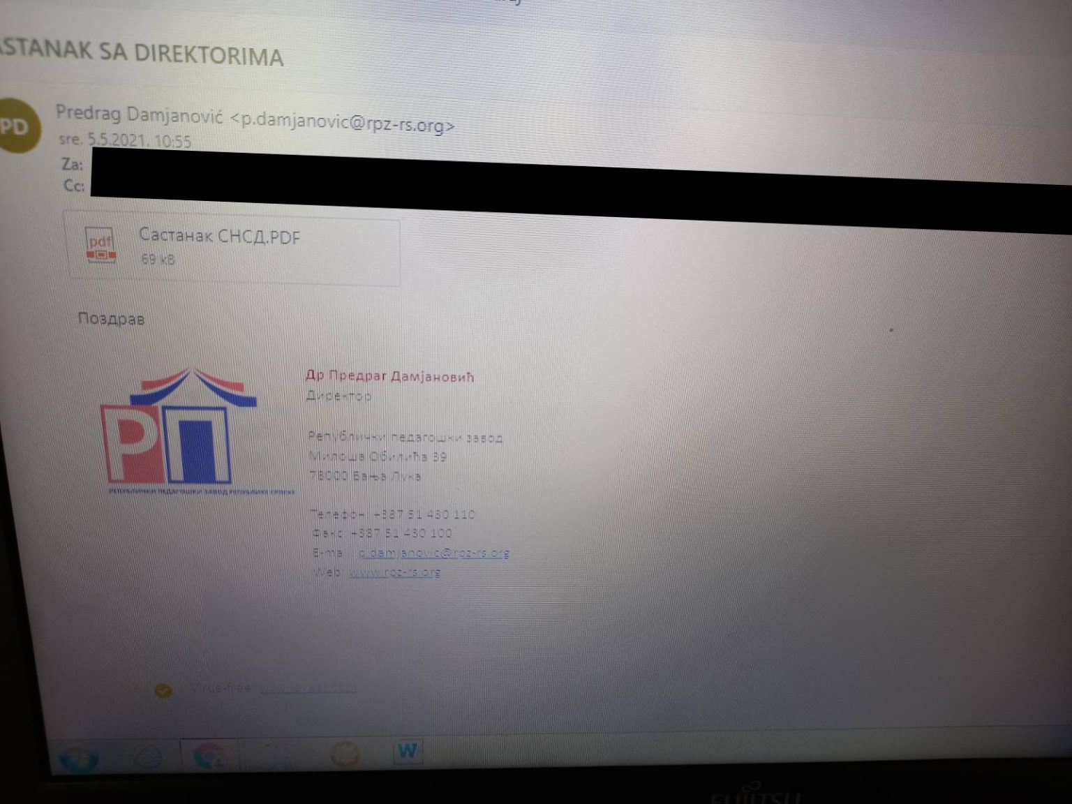 Kontaktirali smo RPZ u želji da saznamo zašto direktor Predrag Damjanović poziva direktore škola na sastanak u prostorije SNSD-a, ali nam je sekretarica rekla da je direktor na sastanku. Nakon što smo ga konačno dobili, Damjanović je sve negirao, rekao je da nije slao nikakav mejl i da nema pojma o čemu se radi iako se jasno vidi da je mejl kojim se poziva na stranački sastanak Damjanović poslao sa logom Republičkog pedagoškog zavoda.