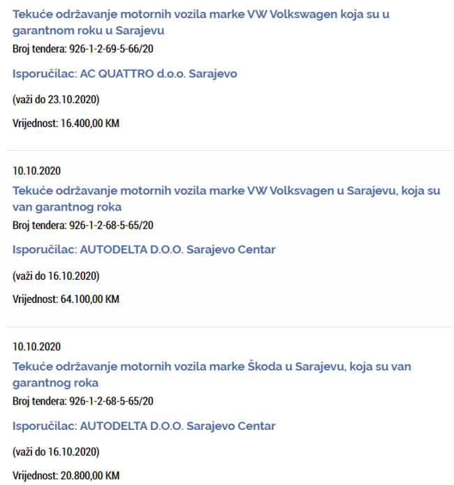 Firmi “AC Quatro” d.o.o, Sarajevo je povjereno održavanje Volksvagen automobila, ali koji su u garantnom roku, i za ovaj posao dobijaju 16.400. KM, dok će firma Porsche Inter Auto BH d.o.o. Sarajevo dobiti 15.900 KM za održavanje Škoda koja su u garantnom roku.