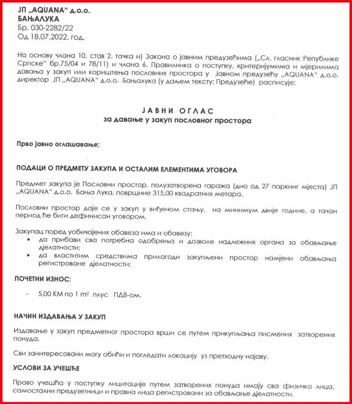 Javni oglas za davanje u zakup poslovnog prostora objavljen je 18. jula 2022. Predmet zakupa bila je poluzatvorena garaža „Akvane“ (dio od 27 parking mjesta), ukupne površine 315 kvadratnih metara.