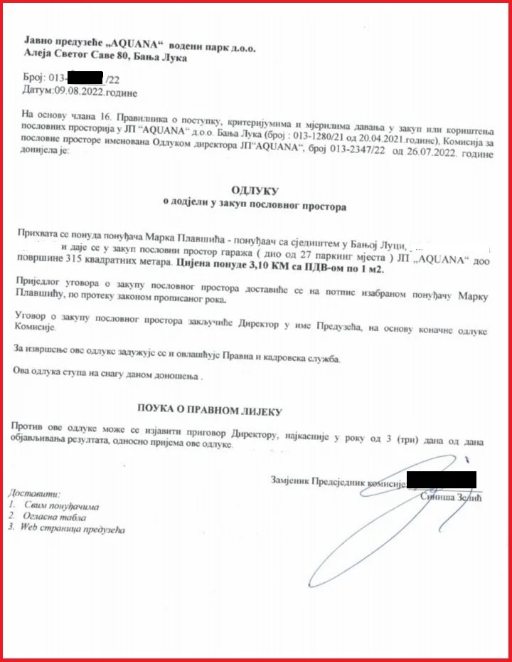 „Prihvata se ponuda ponuđača Marka Plavšića i daje se u zakup poslovni prostor – garaža (dio od 27 parking mjesta), JP ‘Akvana’ površine 315 kvadratnih metara. Cijena ponude je 3,10 KM sa PDV-om po metru kvadratnom. Ugovor o zakupu poslovnog prostora zaključiće direktor u ime preduzeća, na osnovu konačne odluke komisije“, piše u odluci.