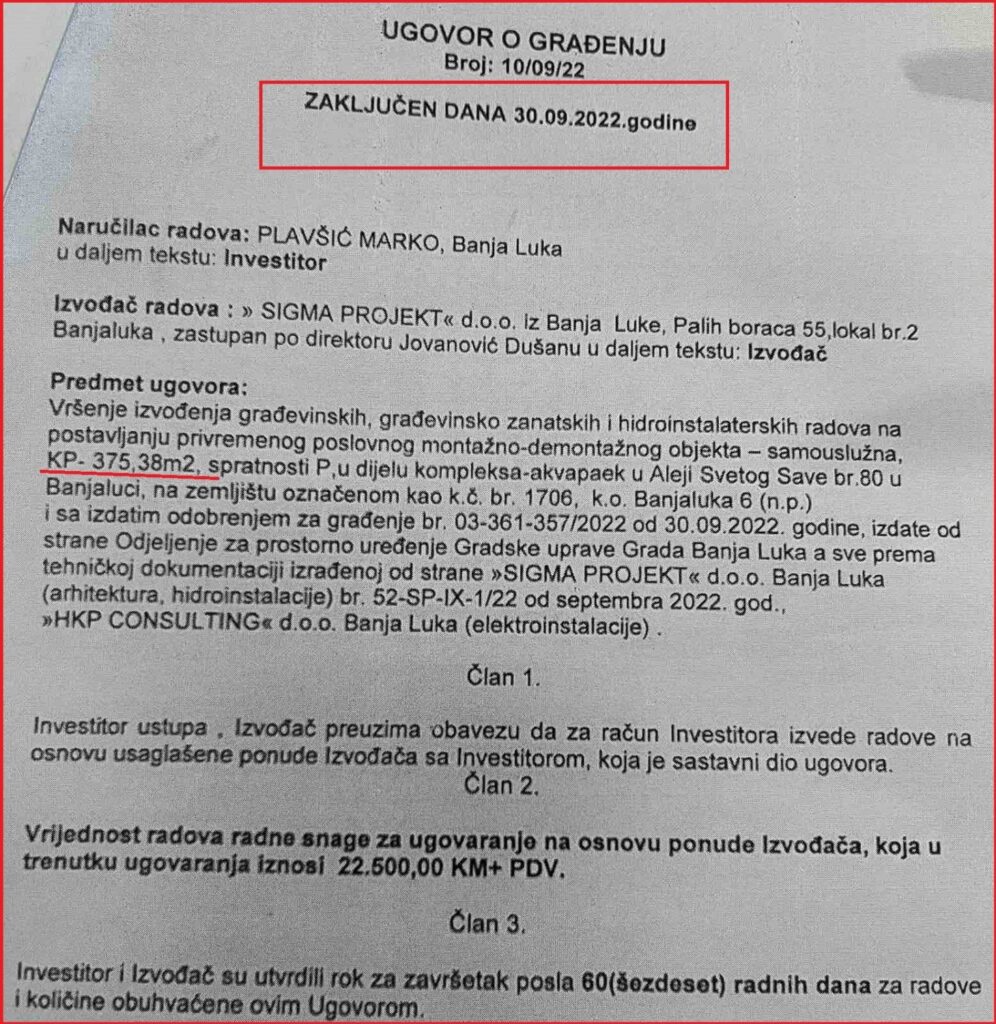 Nakon što je dokumentacija bila „sređena“, nije bilo prepreka za ugovor o građenju, potpisan 30. septembra 2022, između investitora Marka Plavšića i i izvođača radova „Sigma projekta“. Istog dana Gradska uprava Banjaluka, na ime Marka Plavšića, izdala je građevinsku dozvolu. U tom momentu nije mogla da bude pravosnažna.