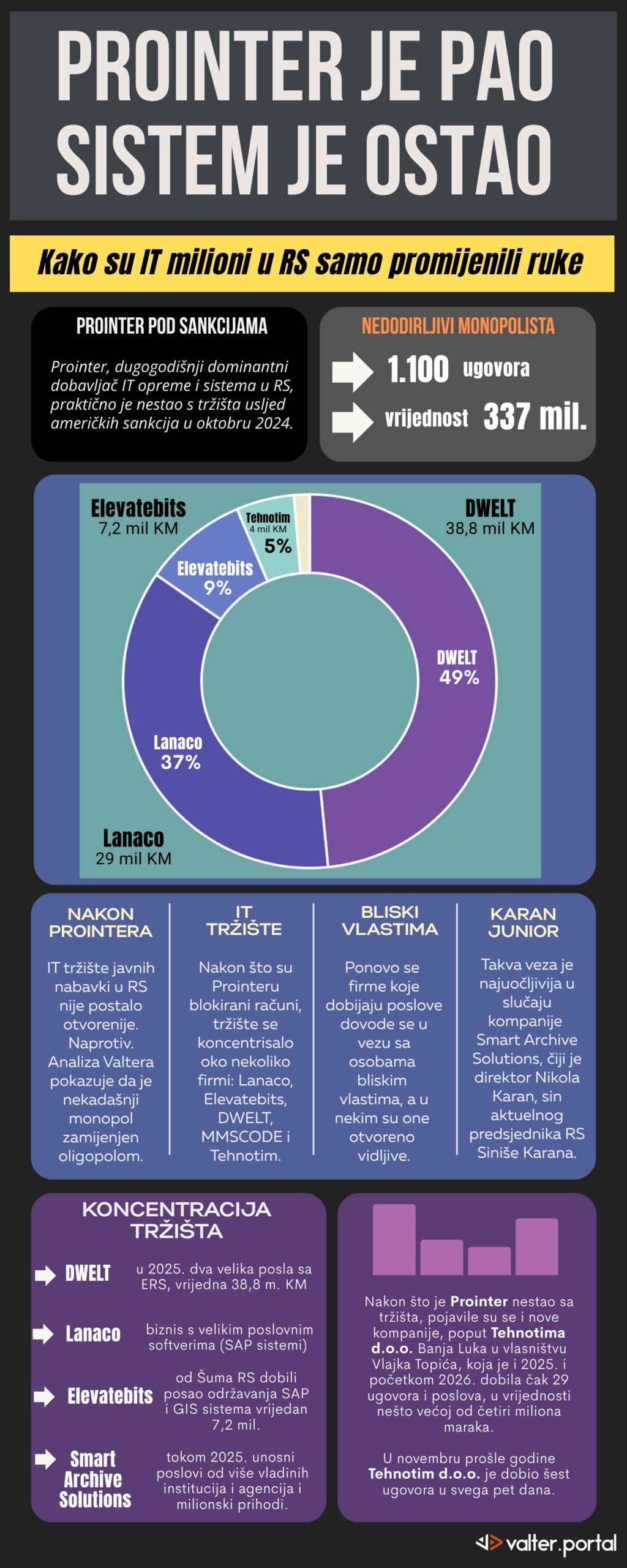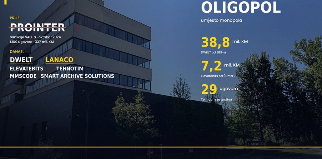 Godinu nakon povlačenja Prointera, IT tržište javnih nabavki u Republici Srpskoj nije postalo otvorenije. Naprotiv. Analiza pokazuje da je nekadašnji monopol zamijenjen oligopolom – sistemom u kojem nekoliko firmi kontroliše ključne segmente tržišta, često bez stvarne konkurencije. Poslovi vrijedni i do više desetina miliona maraka i dalje se dodjeljuju kroz obrasce koji ograničavaju tržišno nadmetanje. Razlika je samo u tome što danas, umjesto jedne firme, isti model funkcionira kroz više njih, dok poslove i dalje dobijaju pojedinci bliski vlastima.
