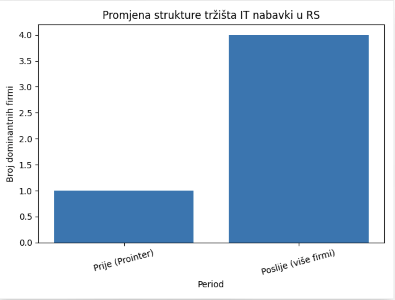Tako godinu nakon povlačenja Prointera, IT tržište javnih nabavki u Republici Srpskoj nije postalo otvorenije. Naprotiv. Analiza pokazuje da je nekadašnji monopol zamijenjen oligopolom – sistemom u kojem nekoliko firmi kontroliše ključne segmente tržišta, često bez stvarne konkurencije.
