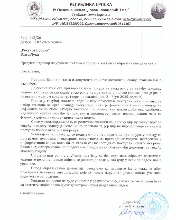 Iz OŠ „Jovan Jovanović Zmaj“ Trebinje dostavljen nam je dopis sa zahtjevom za objavu demantija (kompletan tekst prenosimo u prilogu). U dopisu se navodi da škola u tekućoj školskoj godini nije pokrenula postupak javnog poziva za izbor agencije, te da praksa podrazumijeva da se roditelji prije formalnog pokretanja procedure upoznaju sa programom putovanja i iskustvima iz prethodne godine, isključivo u informativne svrhe, kako bi se stekla saglasnost roditelja da se postupak uopšte pokrene.