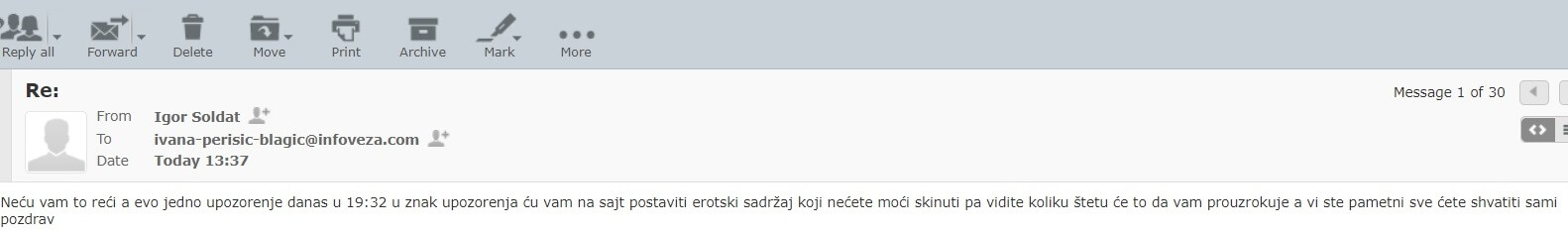 Odgovor na pitanja koje tačno tekstove haker želi da izbrišemo nismo dobili, ali nam je zato danas u 13:37h poručeno da će na sajtu našeg portala u 19:32 osvanuti određeni erotski sadržaji.