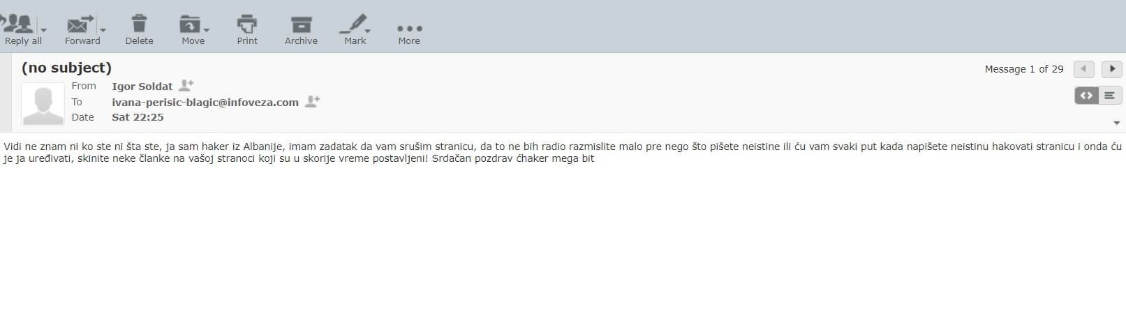 Na jedan od redakcijskih mejlova portala Infoveza počinju da stižu prijetnje hakerskim napadima, u kojima naš medij upozoravaju da će se obračunati sa nama na način da će nam srušiti stranicu portala. Prijetnje su počele da stižu kasno sinoć.