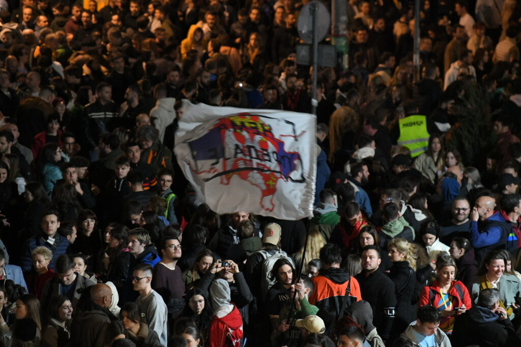 Studentkinja Đurđa Senić, koja je cijelu noć provela ispred RTS, kaže da nisu umorni, da „pumpaju jako“ i da ni kiša ne može da im pokvari raspoloženje.