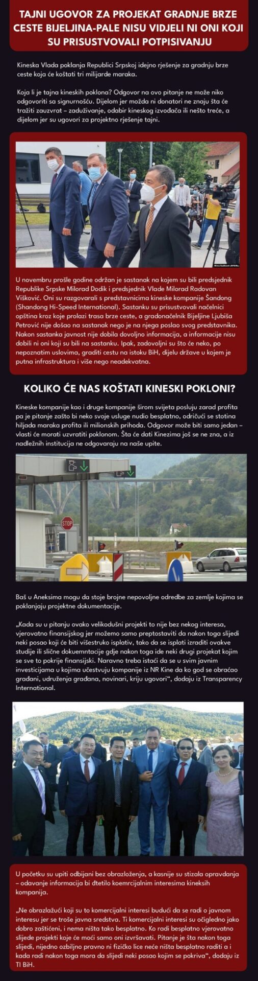 Kineska kompanija iz Shandong grupacije, poznata po tajnim ugovorima, Autoputevima Republike Srpske poklanja idejno rješenje za gradnju brze ceste koja će koštati tri milijarde maraka. Ugovor pak nisu vidjeli ni oni koji su prisustvovali potpisivanju.