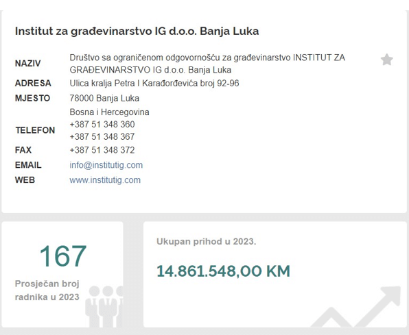 Institut za građevinarstvo “IG” Banja Luka sada djeluje samostalno i sa prihodom iz 2023. od skoro 15 miliona KM dosta uspješno osvaja tendere koje raspisuju brojne javne kompanije.