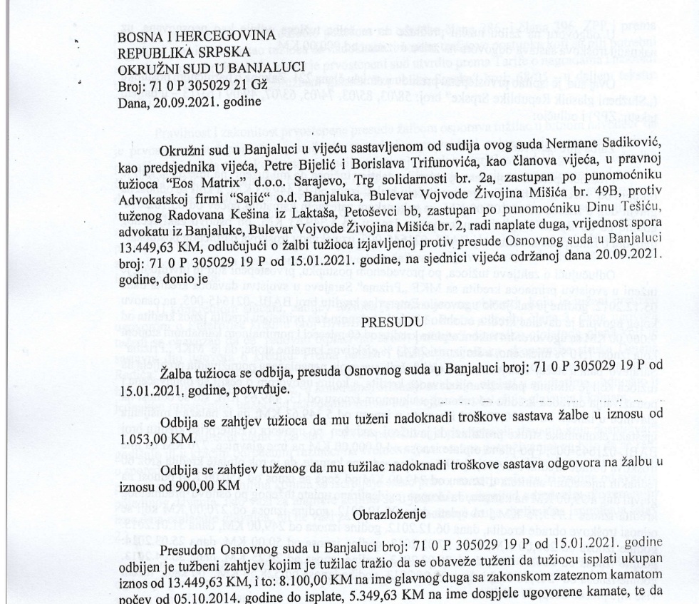 Almost at the same time, the same court ruled in favour of Stevo Boroja from Mrkonjić Grad, from whom “Eos matrix” demanded over 9.5 thousand KM.