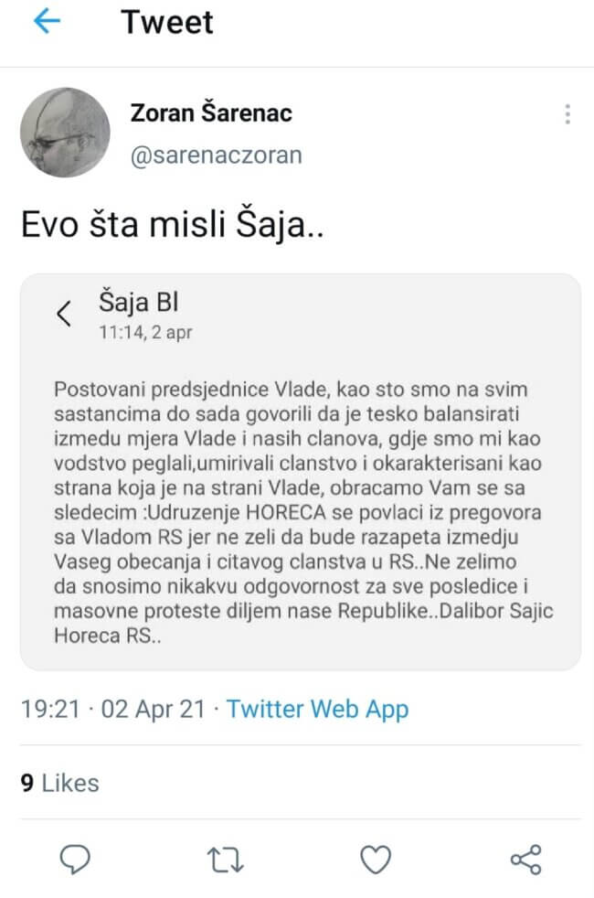 Prema nezvaničnim informacijama do kojih je došao naš portal,  udruženje ugostitelja “HoReCa” namjerava obustaviti saradnju i dijalog s Vladom Republike Srpske, zbog toga što, kako je navedeno, neće da snose posljedice propasti ugostitelja.