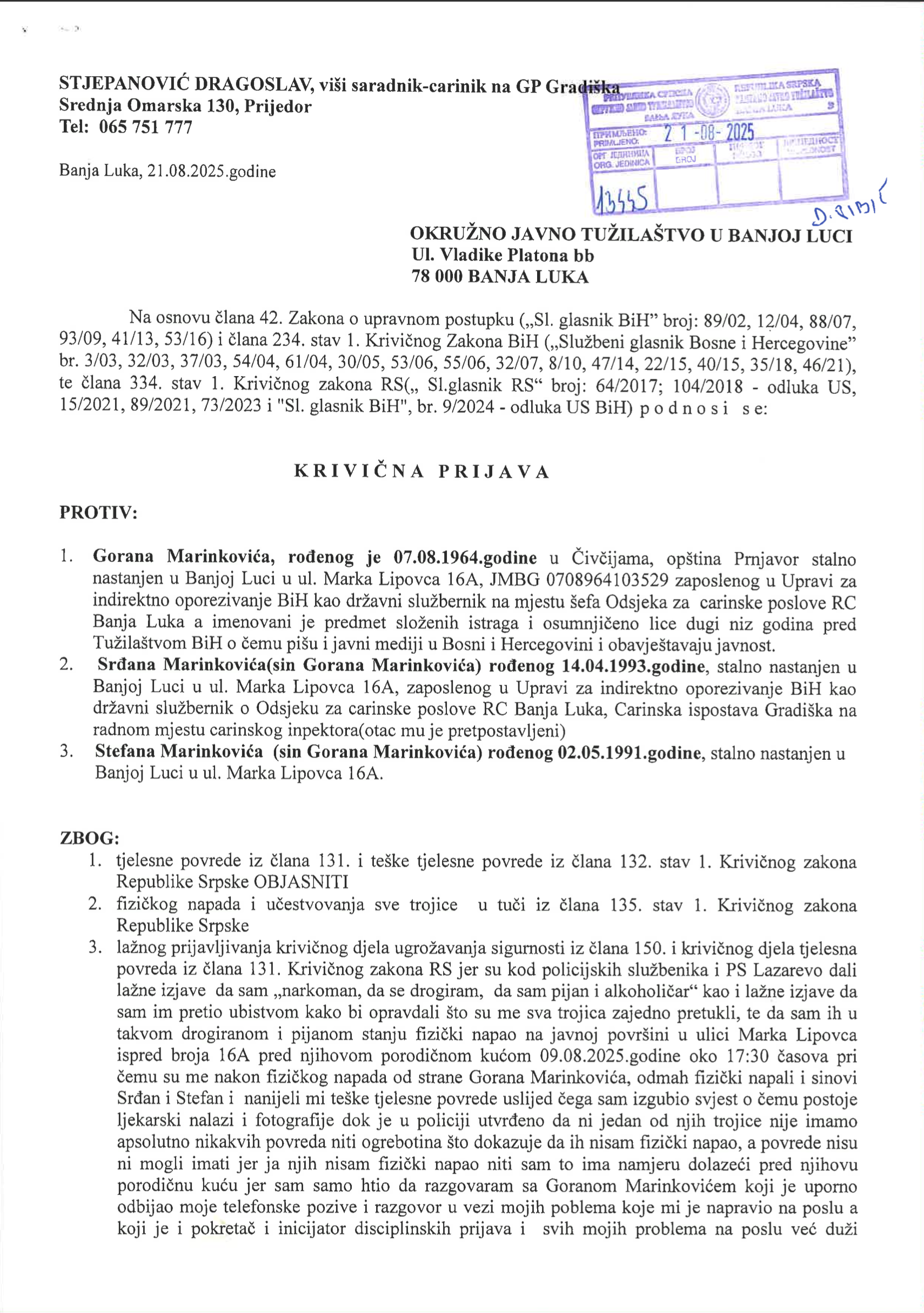 „U subotu 09.08.2025. oko 17:30 časova sam se pokušao obratiti Goranu Marinkoviću ispred njegove porodične kuće i da razgovorom riješimo ovu nezdravu i nepotrebnu situaciju, te da razjasnimo zašto to radi i zašto želi da me ostavi bez posla, njegov odgovor je bio dok sam razgovarao s njegovim sinom Srđanom i radnim kolegom iz CI Gradiška da je iz svog dvorišta izletio samo u šorcu na Ulicu Marka Lipovca koja je javna površina, udario me desnom nogom u predjelu slabina i lijevog bubrega bez bilo kakvog upozorenja, što je bio povod i za dvojicu njegovih sinova Srđana i Stefana koji su imali neke improvizovane boksere na desnoj ruci“, opisuje Stjepanović u obraćanju Samostalnom sindikatu UIO (čiji je član) te navodi da su ga Marinkovićevi sinovi također odmah počeli udarati.