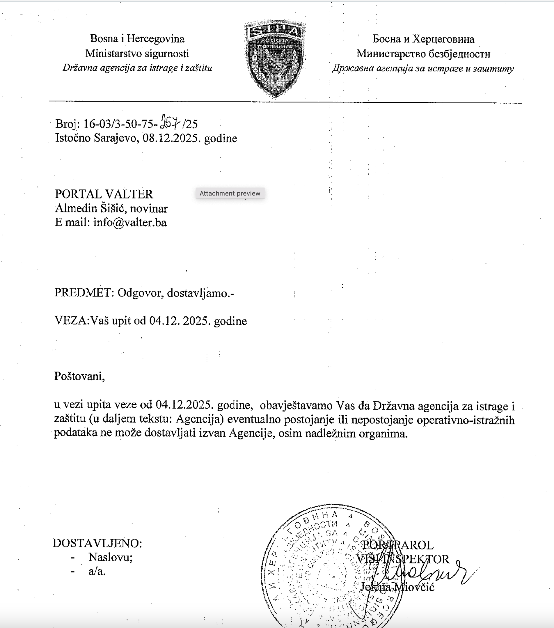 „Poštovani, u vezi upita veze od 04.12.2025. godine obavještavamo vas da Državna agencija za istrage i zaštitu eventualno postojanje ili nepostojanje operativno-istražnih podataka ne može dostavljati izvan Agencije, osim nadležnim organima“, stoji u odgovoru iz SIPA. Zbog kratkoće vremena nismo bili u mogućnosti da se obratimo po Zakonu o slobodi pristupa informacijama, koji predviđa mogućnost 15 dana za dostavljanje odgovora, no ne sumnjamo da bismo dobili isti odgovor.