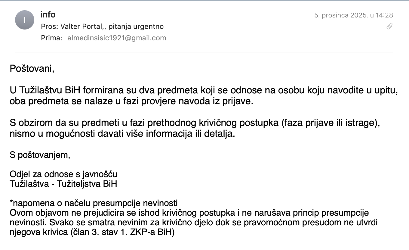 Nakon što nam je odgovoreno da se „za sve informacije obratimo Tužilaštvu BiH“, pitali smo da nam odgovore da li to znači da su krivična prijava i eventualni formirani predmet poslani Tužilaštvu BiH na daljnje postupanje – i po čijoj je to odluci ili zahtjevu? Na na ovo pitanje smo dobili iznenađujući odgovor, koji je glasio: