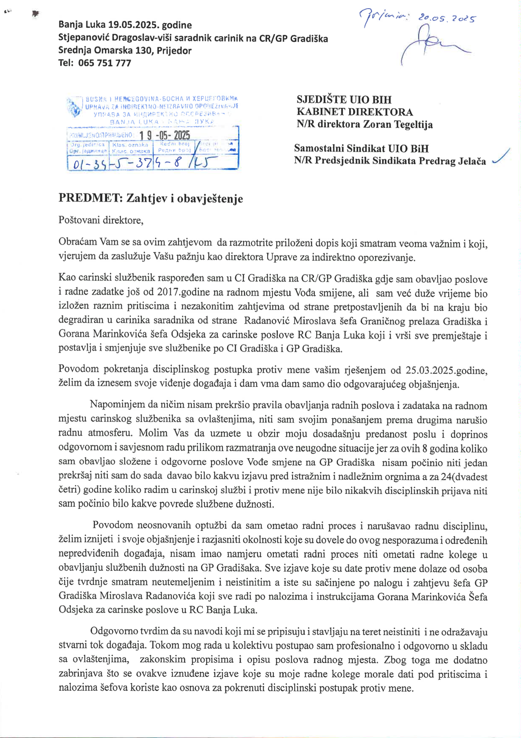 „Carinski službenik Stjepanović Dragoslav tri puta se pismeno obraćao Sindikalnoj organizaciji kao njen član, prvi puta 02.04.2025., drugi put 19.05.2025., kada iznosi ozbiljne optužbe na račun nekih rukovodilaca i zaposlenih Odsjeka za carinske poslove u RC Banja Luka sa obilježjima krivičnog djela te je Sindikalna organizacija sačinila obavještenje od 20.05.2025. i podnesene zahtjeve dostavila Odsjeku za unutrašnju kontrolu i Odsjeku za profesionalne standarde na nadležno postupanje. Treći puta se obratio 15.08.2025., i iznio uznemirujuće i ozbiljne optužbe na račun šefa Odsjeka za carinske poslove Gorana Marinkovića i njegovih sinova Srđana i Stefana, koji su ga brutalno pretukli i nanijeli mu teške tjelesne povrede“, piše u odgovoru Samostalnog sindikata UIO BiH Valteru, te se naglašava: