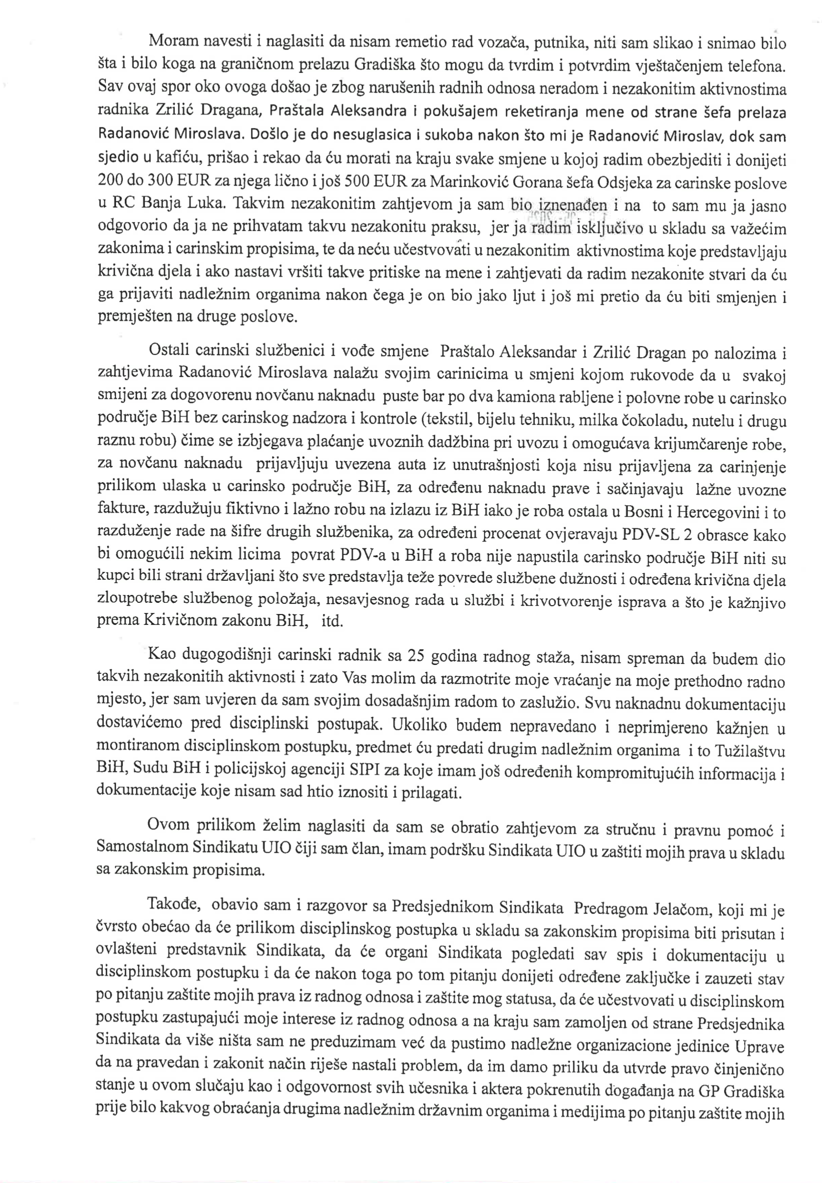 „Ostali carinski službenici i vođe smjene Praštalo Aleksandar i Zrilić Dragan po nalozima i zahtjevima Radanović Miroslava nalažu svojim carinicima u smjeni kojom rukovode da u svakoj smjeni za dogovorenu novčanu naknadu puste barem po dva kamiona rabljene i polovne robe u carinsko područje BiH bez carinskog nadzora i kontrole (tekstil, bijelu tehniku, milka čokolade, nutelu i drugu raznu robu), čime se izbjegava plaćanje uvoznih dadžbina i omogućava krijumčarenje robe, za novčanu naknadu prijavljuju uvezena auta iz unutrašnjosti koja nisu prijavljena za carinjenje prilikom ulaska u carinsko područje BiH, za naknadu sačinjavaju lažne uvozne fakture, razdužuju fiktivno i lažno robu na izlazu iz BiH iako je roba ostala u BiH“, iznosi dalje Stjepanović frapantne podatke o organiziranom kriminalu, korupciji i činjenu velike štete državnom budžetu.