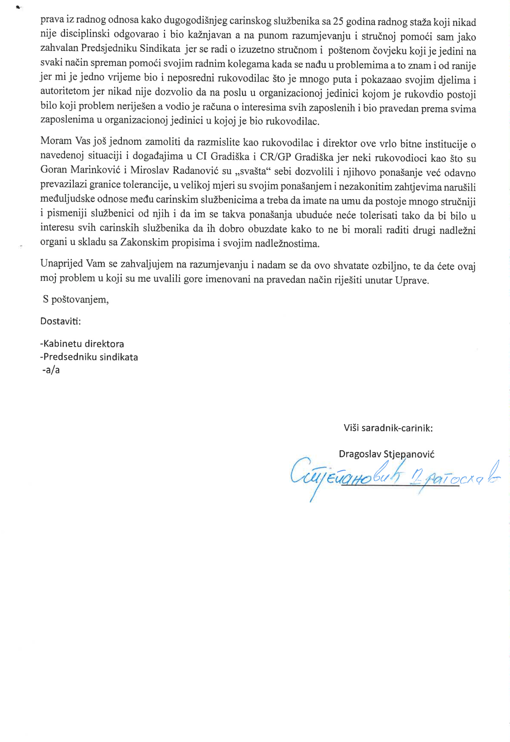 U maju ove godine Stjepanović se obratio pismeno direktno u kabinet direktora Tegeltije, navodeći u svom „zahtjevu za razmatranje cijele situacije“ pojedine uistinu frapantne informacije, uključujući imena carinika koji učestvuju u organiziranoj korupciji i kriminalu i metode šverca robe na GP i CI Gradiška. U uvodu pojašnjava da su od nekih njegovih kolega iznuđene izjave kako bi protiv njega bio pokrenut disciplinski postupak, te odmah potom navodi.