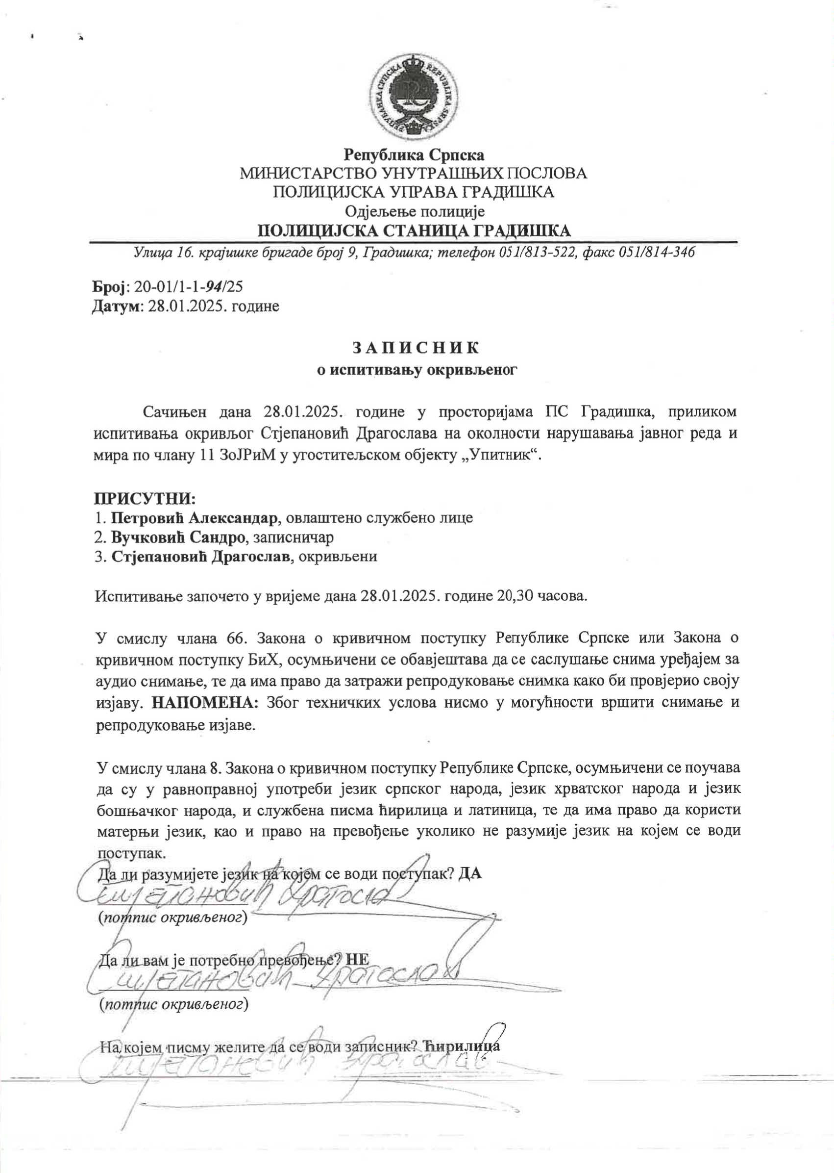 „Dana 28.1.20205., oko 09.00 časova pio sam kafu u kafiću ‘Upitnik’ gdje sam došao svojim privatnim vozilom i isti parkirao desno pored kafića. Oko 09.45 u kafić dolazi vođa referata GP Gradiška, Radanović Miroslav, sjeda pored mene, naručuje piće i zamoljava me da sjednemo u separe koji se nalazi pored toaleta. U tom momentu sam pitao u čemu je problem, na šta sam istom odgovorio da ne vidim problem u sebi, već u njima, misleći na radnje koje obavljaju na GP Gradiška, a koje nisam htio da prihvatam na njegov nagovor. Radanović Miroslav mi saopštava da svaku smjenu moram da dam 200 do 300 eura njemu i 500 eura šefu regionalnog centra Banja Luka, Marinković Goranu. Ja sam mu tada objasnio da ja nisam iz te priče, da nikada od mene to neće dobiti, niti ja želim da se bavim takvim poslovima, a ovaj posao radim po pozitivnim carinskim propisima“, napisao je, između ostalog, Stjepanović u službenoj izjavi policiji u Gradišci, navodeći da je „čista laž da je Radanoviću ili bilo kome drugom prijetio ubistvom“, posebno naglašavajući da se „za 25 godina radnog staža nije načinio nikakav prekršaj, niti bilo kada davao izjavu policijskim agencijama u svojstvu osumnjičenog“.