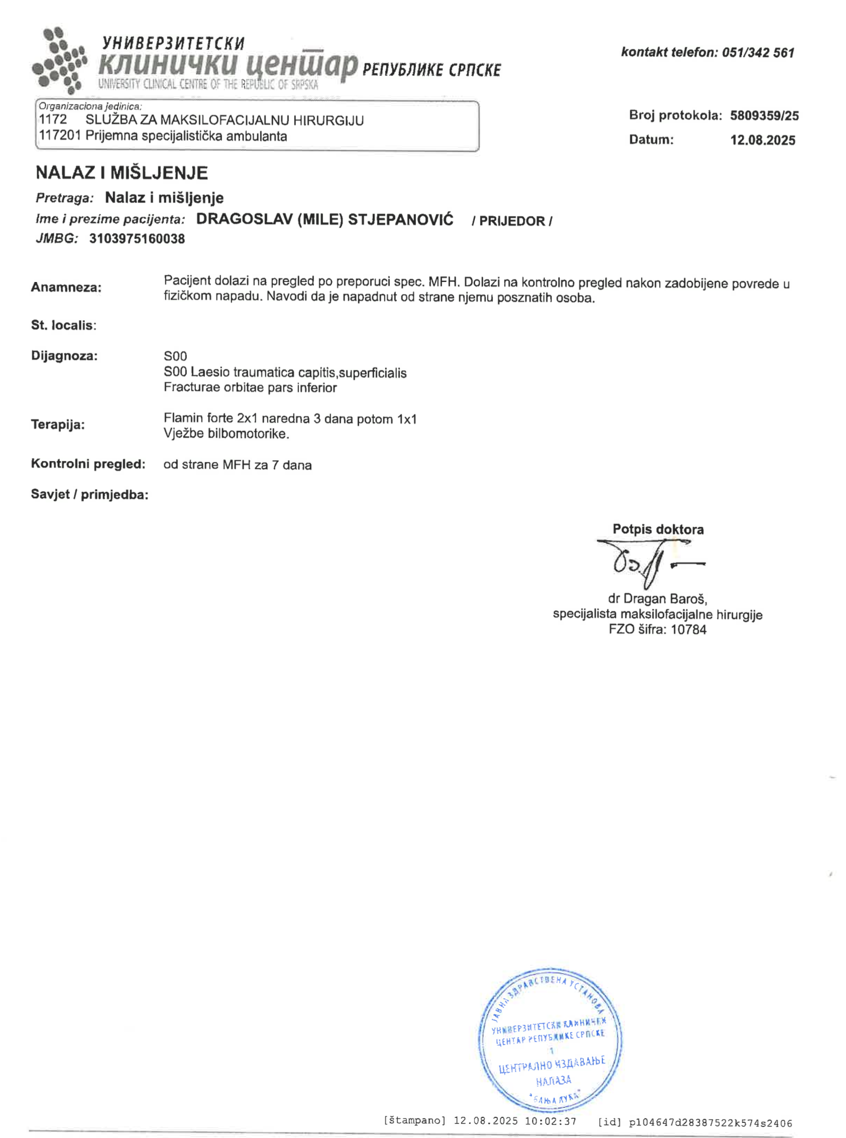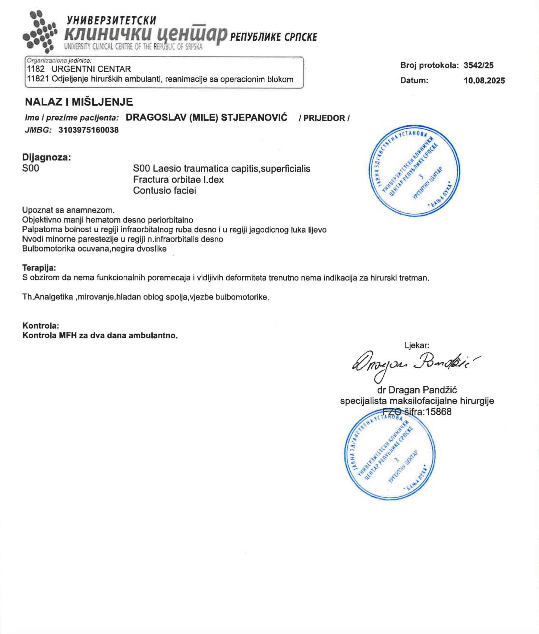 Nakon mjeseci agonije Stjepanović je, prema vlastitom svjedočenju, 9. avgusta ove godine pokušao razgovarati sa Marinkovićem ispred njegove kuće (banjalučko naselje Budžak, op.a.), „kako bi pokušali razgovorom da riješe nepotrebnu i nezdravu situaciju“. Šta se potom dešavalo – možda bolje od bilo kakvih izjava mogu da posvjedoče fotografije koje ekskluzivno objavljujemo, kao i ljekarski nalazi. Na njima je vidljivo i uočljivo da je Stjepanović tu teško pretučen, dakle suprotno od onoga kako su izvijestili mediji. Kako je i na koji način tu nastupio Stjepanović – teško je pretpostaviti jer nije bilo svjedoka, no logična pretpostavka jeste da bi samo neuračunljiva osoba došla sama pred kuću svom pretpostavljenom i fizički krenula da se obračuna s njim i dva duplo mlađa muškarca (njegovim sinovima).