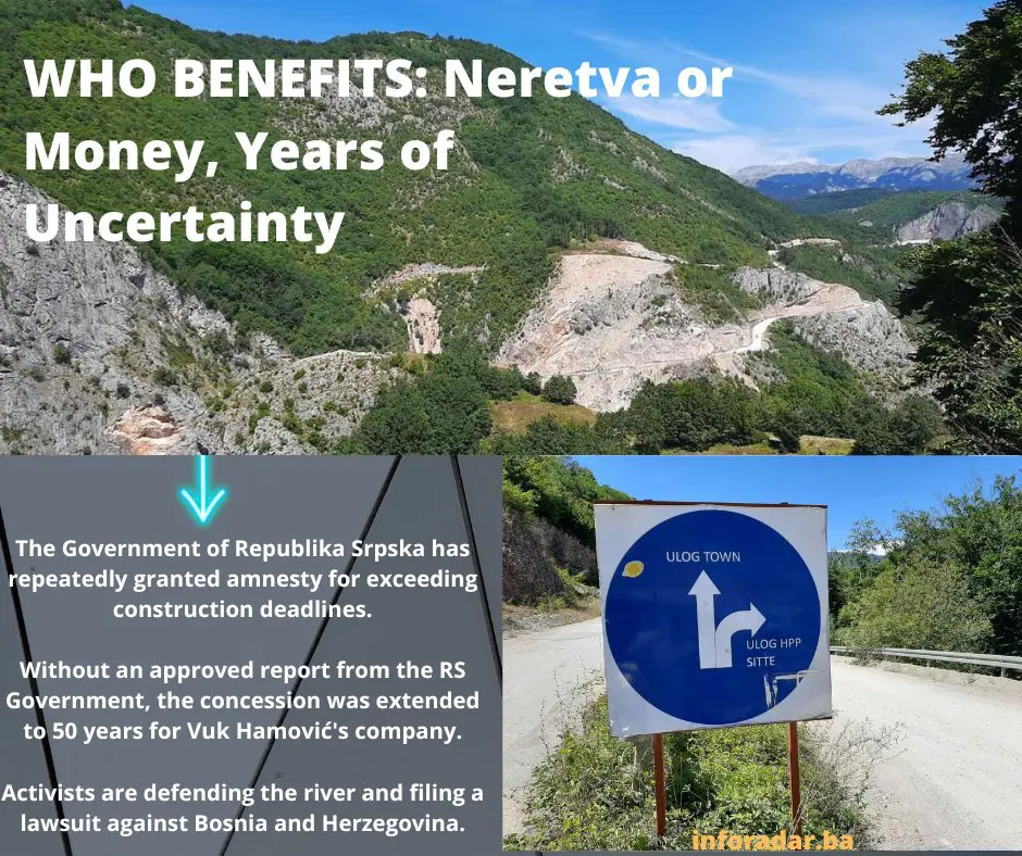 The Ulog Hydroelectric Power Plant on the Neretva River, as seen on the sign at the construction site entrance, was supposed to be completed two months ago, specifically on June 19, 2023. The construction, which was repeatedly delayed, was initially scheduled for December 20, 2019, but the machines were only set in motion the following summer. The construction permit was issued by the Ministry of Spatial Planning, Construction, and Ecology of Republika Srpska. The 30-year concession for construction was awarded to the company “EFT”, owned by Vuk Hamović, the largest electricity trader in the region, who has two companies in Republika Srpska. Meanwhile, without an adopted report in the Government of Republika Srpska, the concession was extended to 50 years. The concession was granted without any permits.